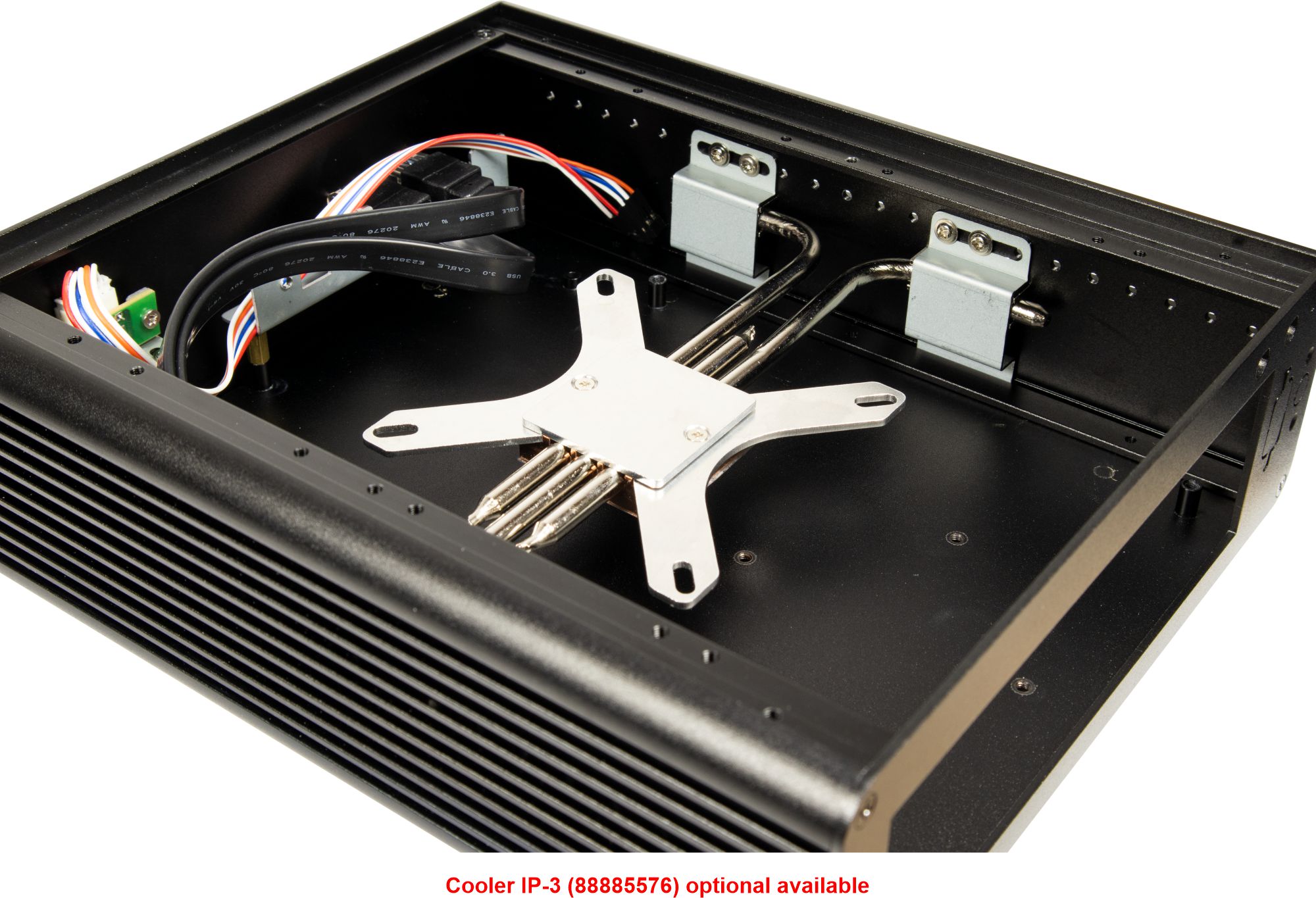 Thanks to the closed design and the integrated cooling fins, it is the ideal candidate for a system with passive cooling. In conjunction with the optional IP-3 cooler, CPUs with a TDP of up to 70W can be installed and operated entirely without active fan elements. Alternatively, other CPU coolers up to 43mm in height can also be installed.